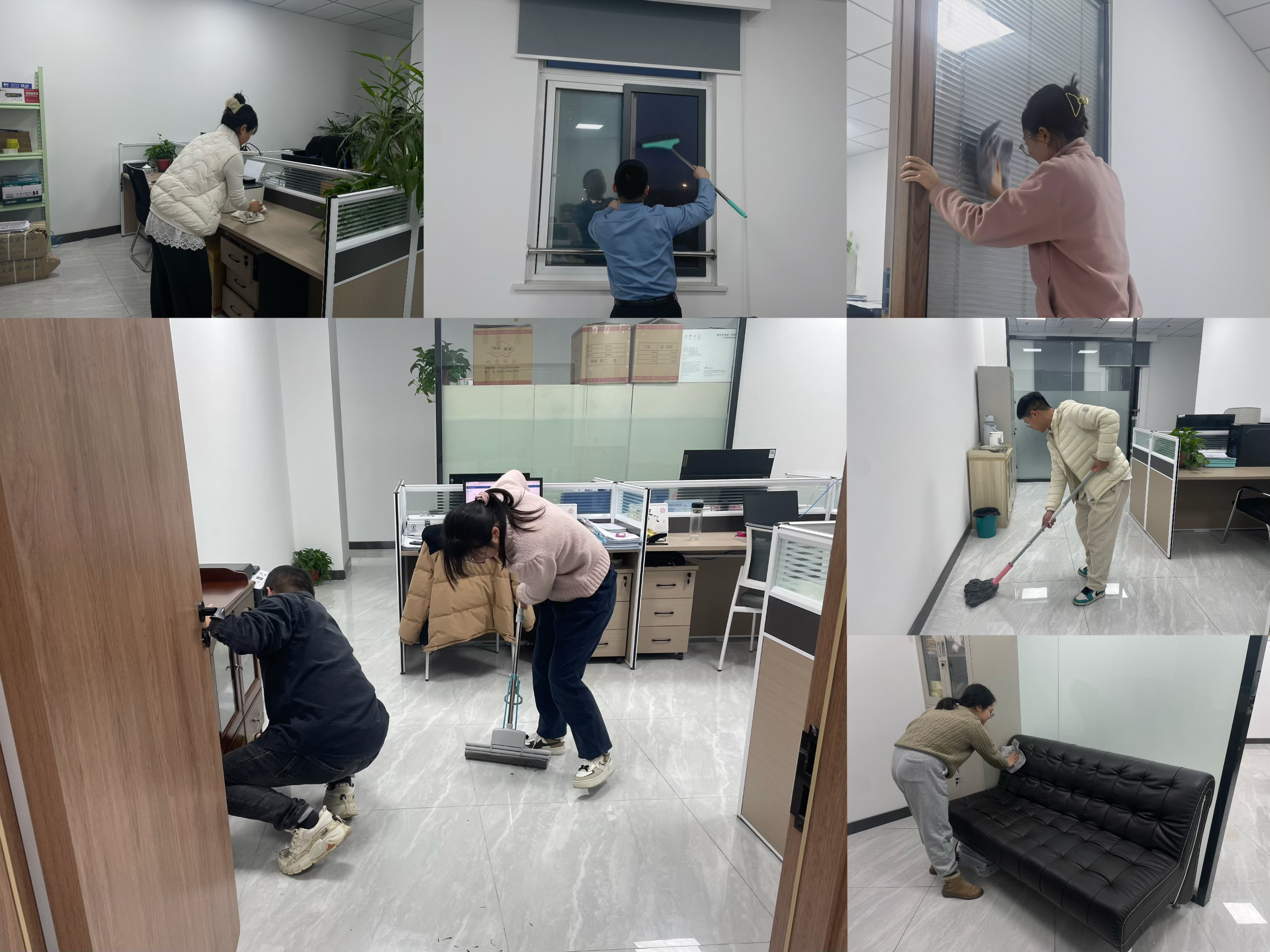 活動中,大家分工明確,配合默契。有的擦拭辦公設備,有的清掃地面,有的分類整理辦公用品、資料文件,還有的擦拭門窗,讓窗戶明亮通透,仿佛映照著新春的希望。經過眾人共同努力,辦公區域煥然一新。